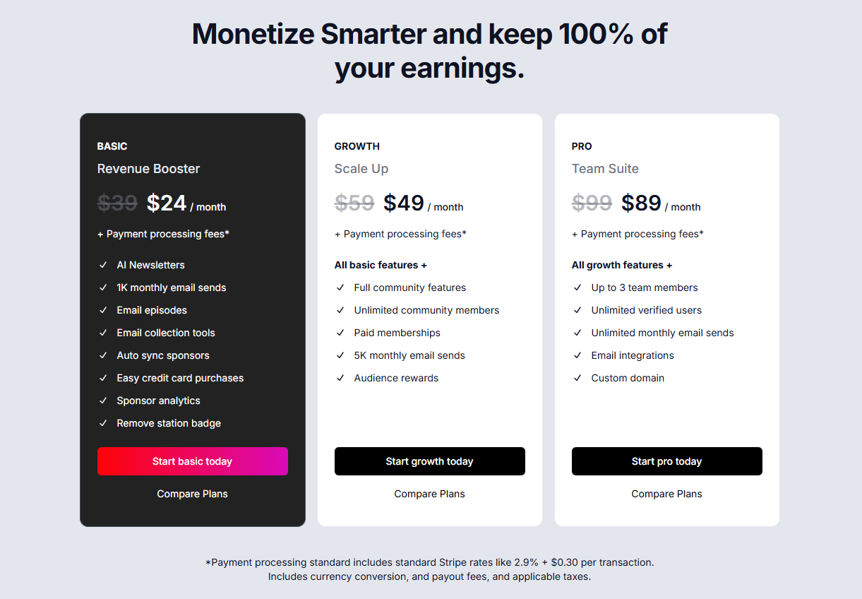 Every creator grows differently, so Station offers flexible plans that scale with you. Here’s a clear breakdown of each plan, what’s included, and which one fits your current stage as a creator.