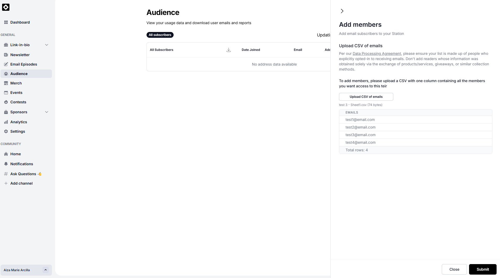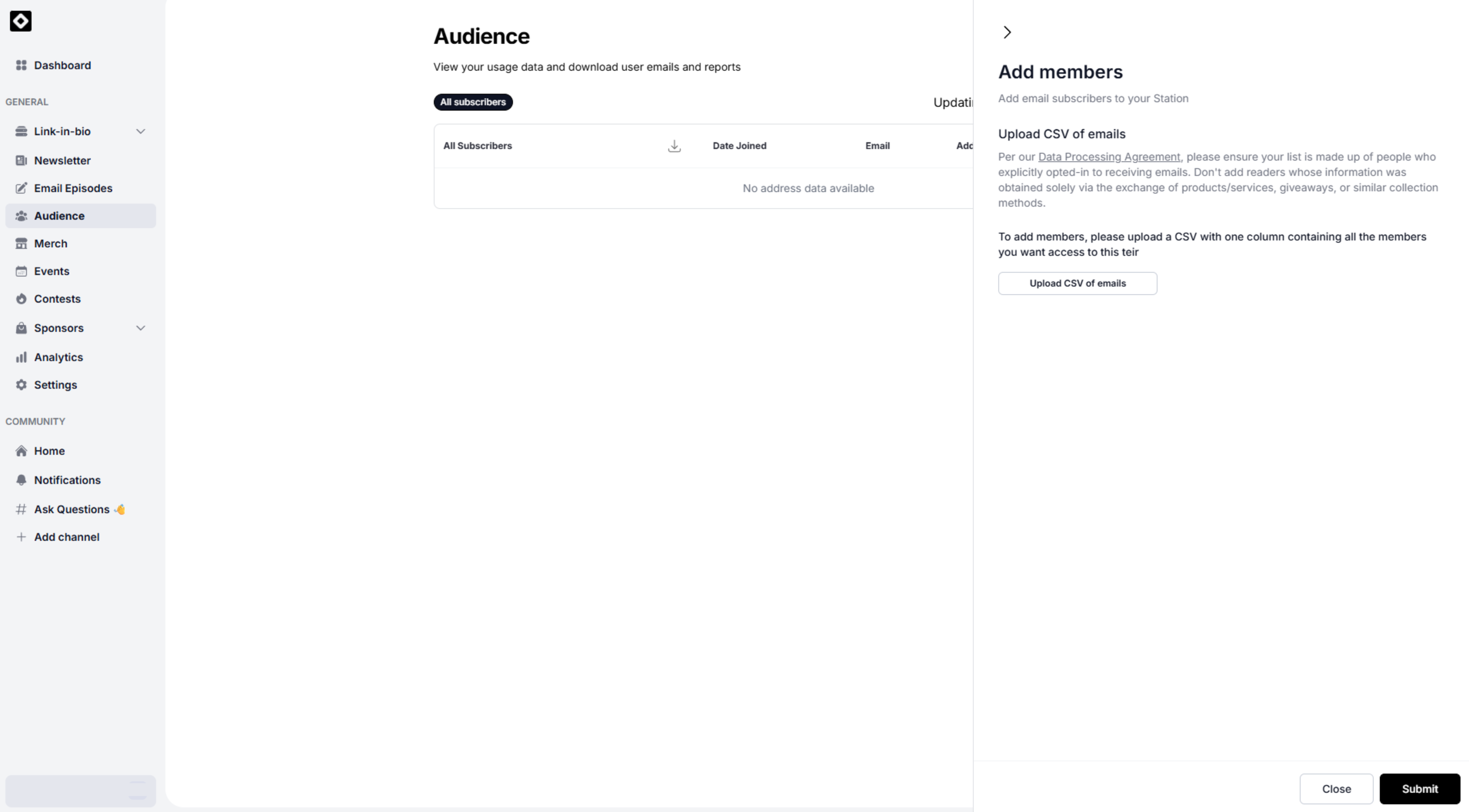 Bring your existing subscribers into Station so you can start sending newsletters, email episodes, and building your community right away.